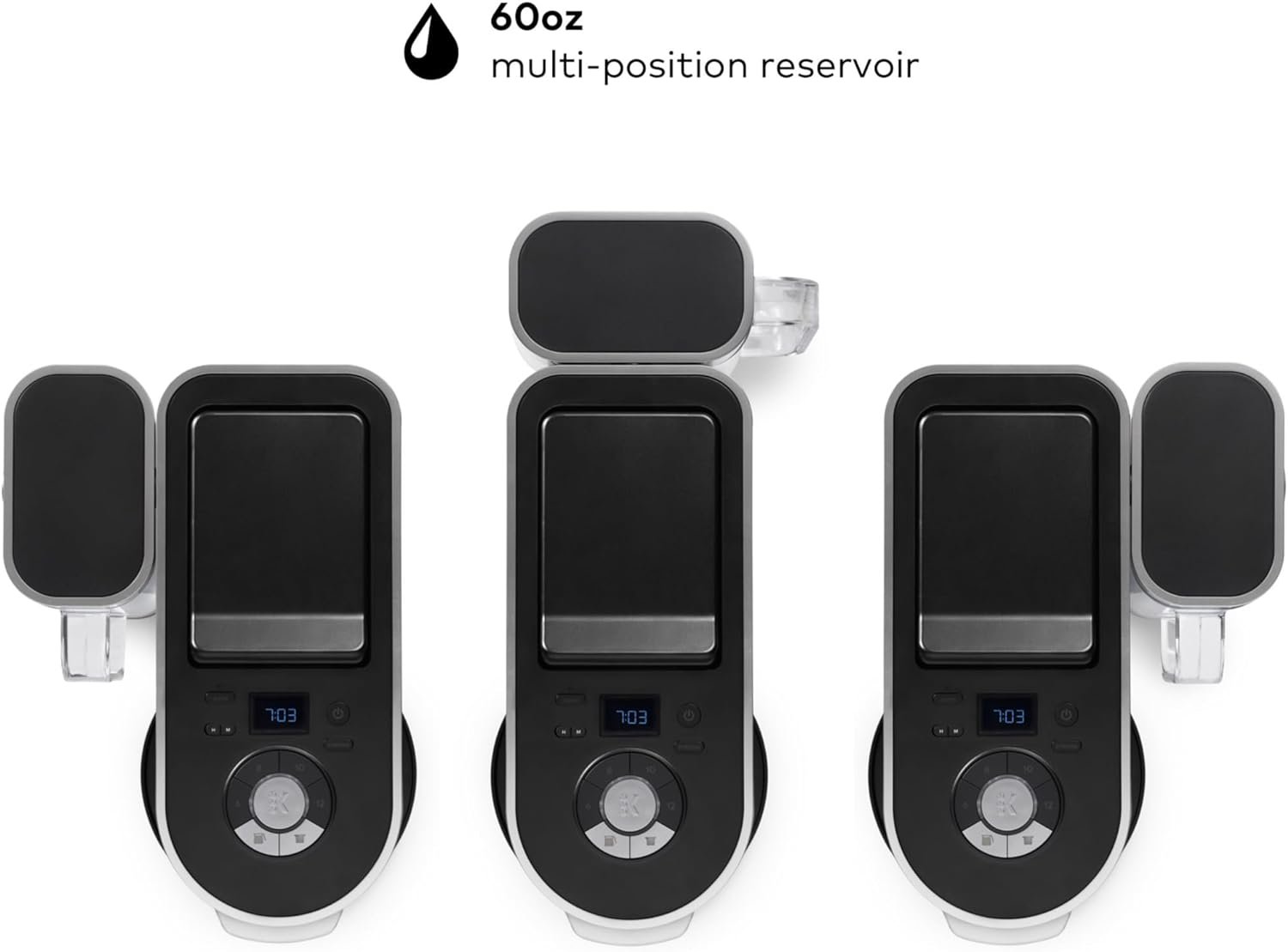 MULTI-POSITION 60 oz. WATER RESERVOIR: Can be positioned to the right, left, or along the back of the brewer to optimize counter space.