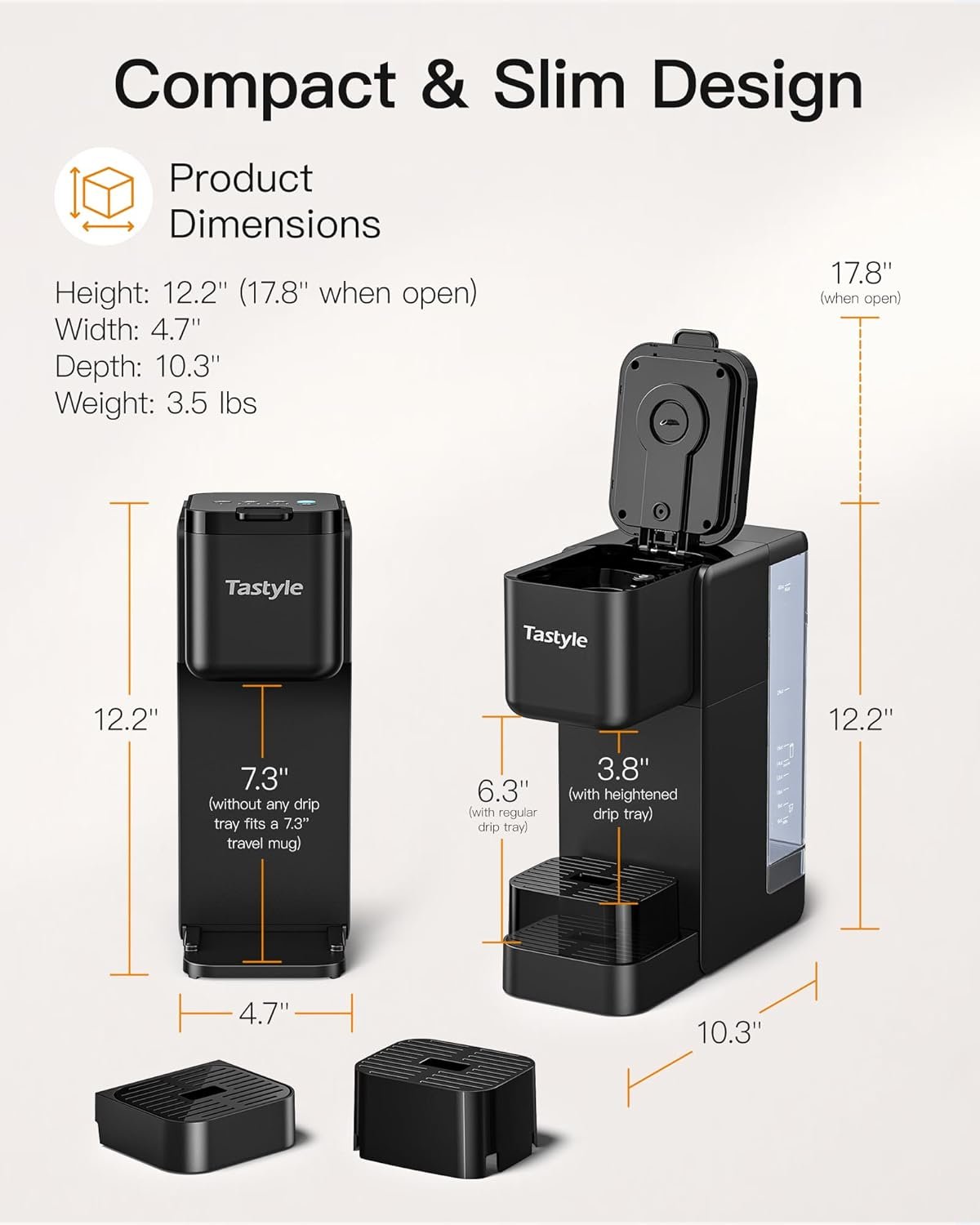 SPLASH-PREVENTING & TRAVEL MUG FRIENDLY: Features a heightened drip tray to prevent coffee splashing due to gravity when dispensing. Accommodates travel mugs up to 7.3” tall after removing drip trays