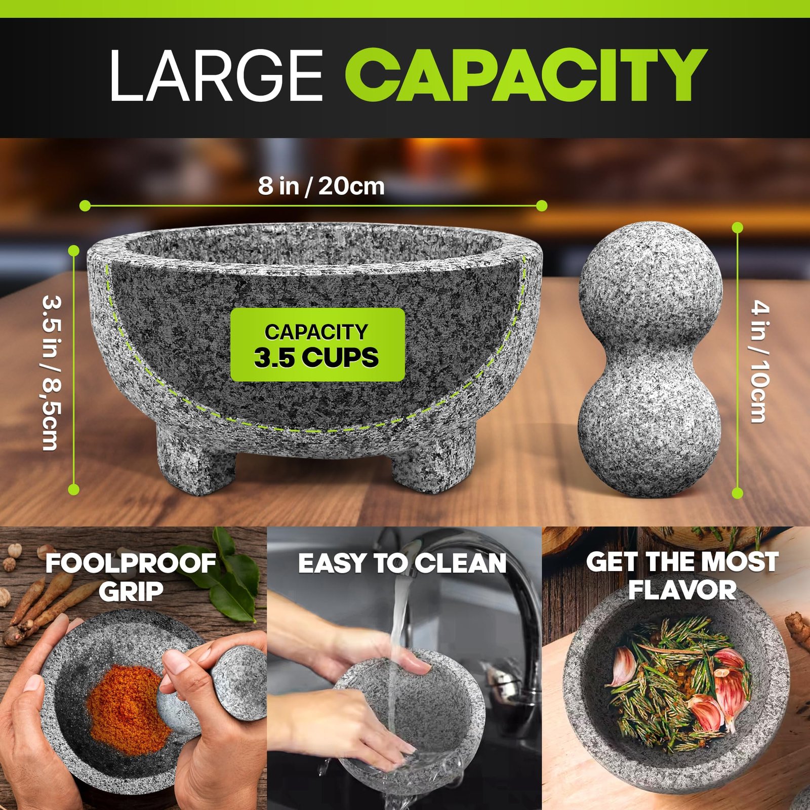 - LARGE CAPACITY: Featuring an 8-inch diameter and 3.5-cup capacity, this granite mortar and pestle set is perfect for grinding, crushing, and mixing spices, herbs, grains, and more. Create delicious guacamole, salsas, and sauces effortlessly!
