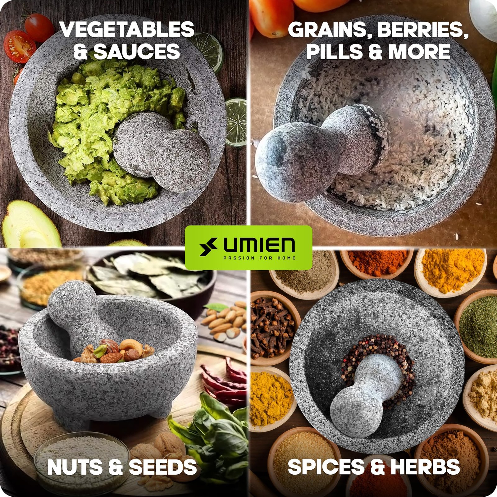 - AUTHENTIC MOLCAJETE DESIGN: Handcrafted with natural granite, this mortar and pestle boasts a stunning color pattern that complements your kitchen décor while doubling as a stylish serving bowl for your favorite recipes